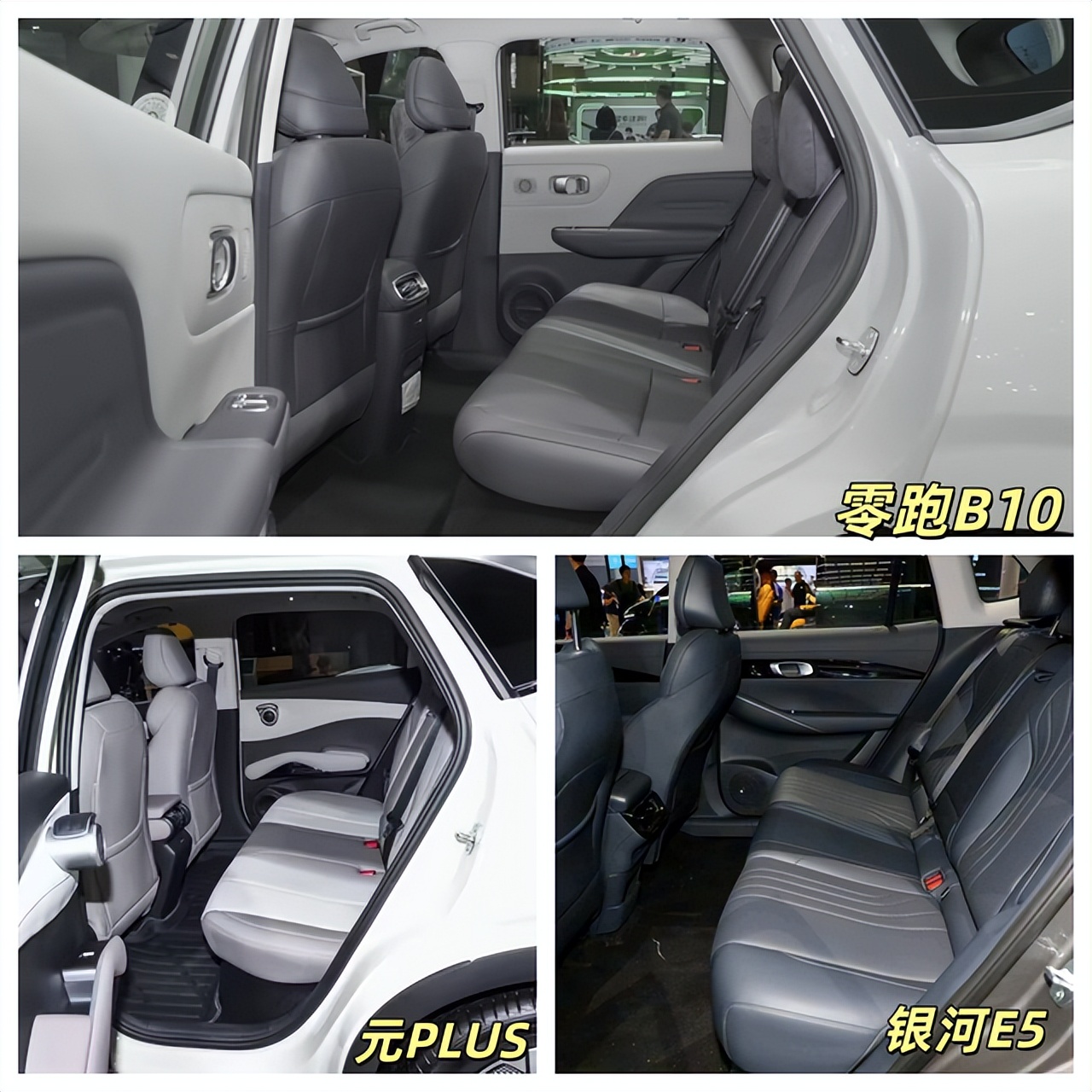 后排空间是重点对比项,银河E5轴距达到2750mm,后排腿部空间有两拳左右,表现不错,但中间地台有轻微凸起,满载三人时中间乘客的舒适性会受影响;元PLUS的后排腿部空间约一拳半,地台凸起不明显,但头部空间因为溜背造型稍显局促,身高180cm的乘客坐进去可能会蹭到车顶;零跑B10的后排腿部空间在一拳半到两拳之间,头部空间也有一拳左右,地台几乎纯平,而且后排座椅支持靠背角度调节,无论是中间乘客还是长途乘坐,舒适性都有保障。