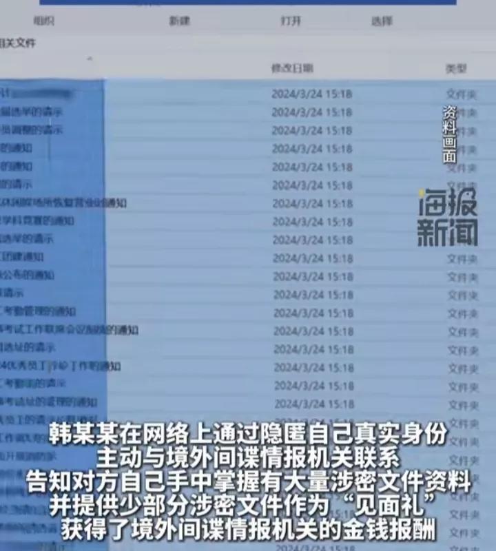 韩某某起初利用互联网匿名渠道,主动对接上了一境外情报机构,展开了联络。他清晰地向对方表示,手中掌握着大量对方必定会感兴趣的文字材料。