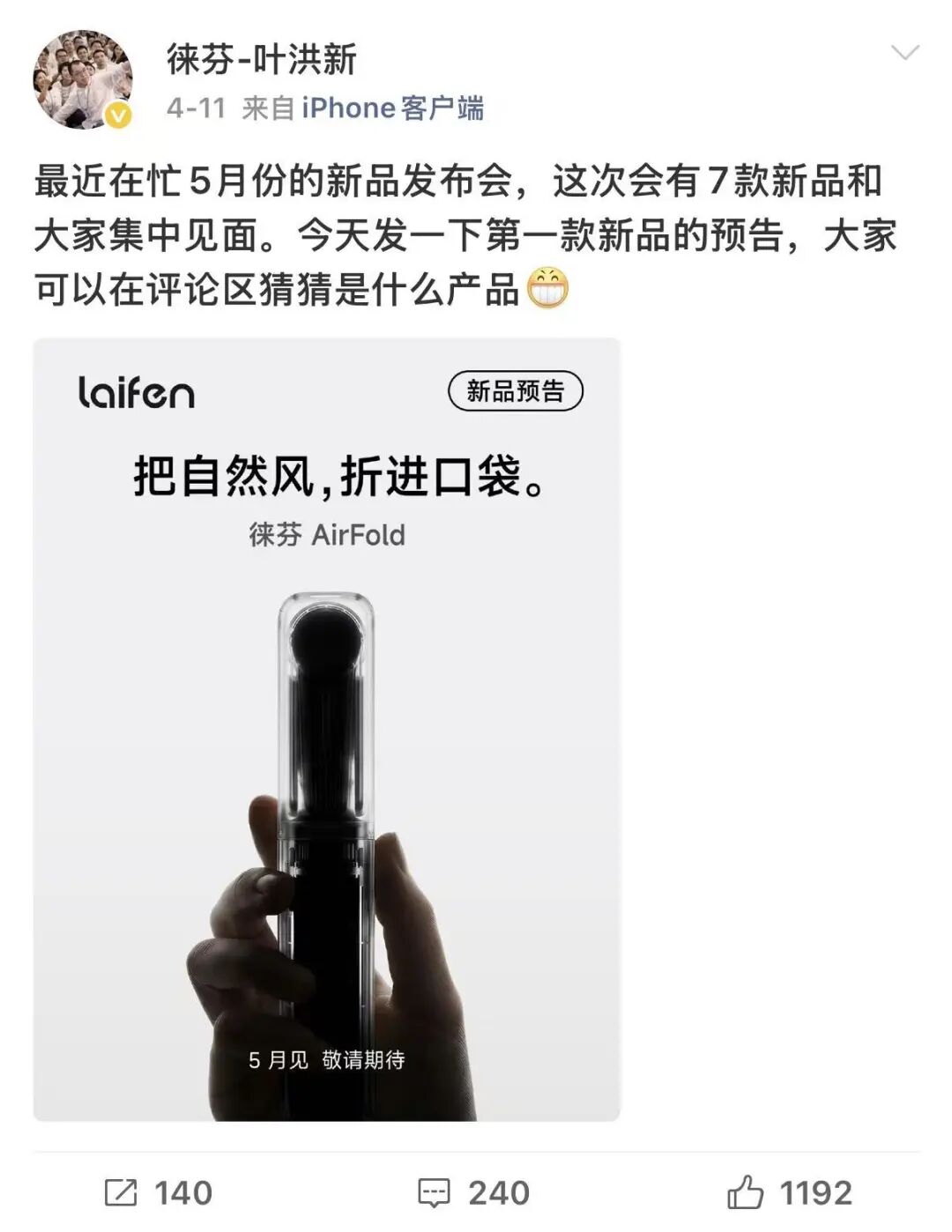 日前,徕芬创始人叶洪新在个人社交账号上放出一张手持便携风扇海报,并宣布在即将到来的5月新品发布会上,徕芬将一口气推出多达7款新品。