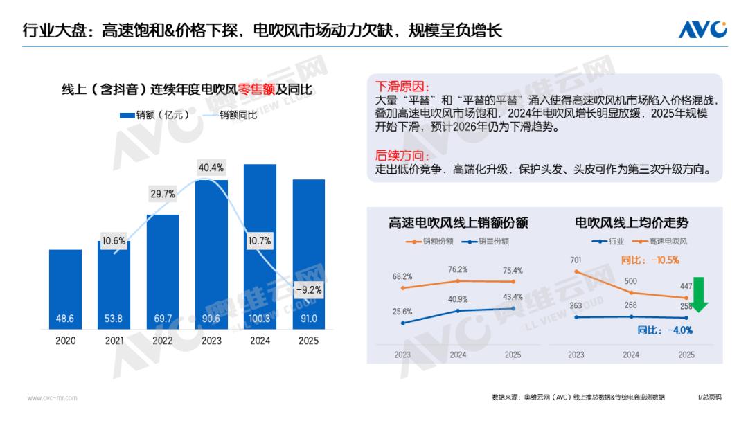 如今,高速电吹风线上销售额已占总市场的约75%,但线上均价却下滑明显,从2023年的701元一路降至2025年的447元。
