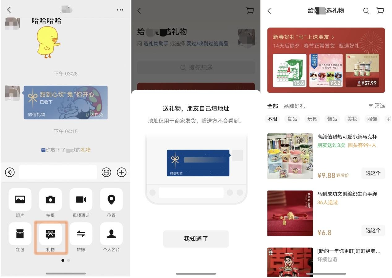 最让我惊喜的是收发礼物功能终于给安排上了,想给亲朋好友送份小礼物,只要在聊天框点“+”号,找到“礼物”,选好年货直接发给亲友,对方会收到一个“小蓝包”,点开自行填写地址就行。更棒的是,2月6日-8日华为超级品牌日期间,鸿蒙版微信也能在微信上赠送限量礼盒,比如日照金山礼盒、周大福礼盒、FreeBuds Pro 5马年典藏版、WATCH GT6情人节礼盒、一马当先通用礼盒等限量好礼,送礼仪式感拉满!