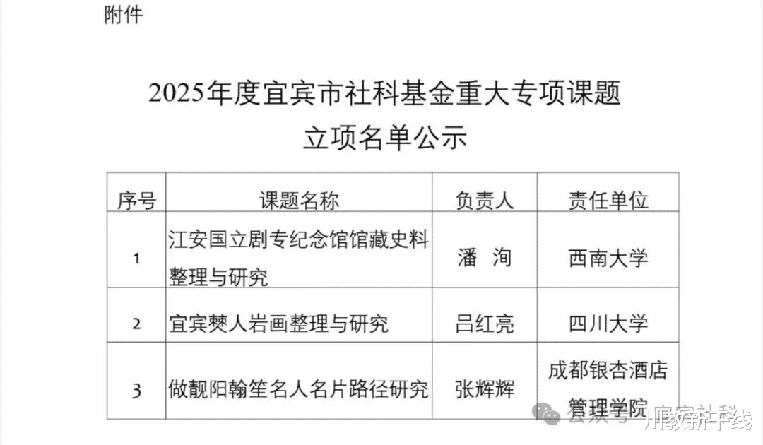 近日,宜宾市社会科学界联合会公布2025年度社科基金重大专项立项名单,成都银杏酒店管理学院文化和旅游学院副院长张辉辉主持的《做靓阳翰笙名人名片路径研究》课题成功立项。该课题将系统研究宜宾籍文化名人阳翰笙的历史价值与当代转化路径,为地方文旅融合发展提供理论支撑和实践方案。