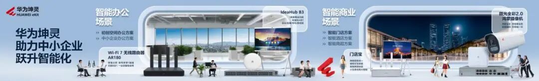 例如,车厢内展示的华为坤灵AR180搭载Wi-Fi 7高速传输技术与鲲鹏CPU架构,融合灵驱AI加速引擎,可为企业及家庭用户提供高速、安全、智能的组网方案;微光全彩2.0鸿蒙摄像机依托鸿蒙超级编码技术,搭载画面防抖算法与双向语音通话功能,为企业、学校、店铺、家庭值守等场景提供全天候、高可靠的智能守护;华为坤灵IdeaHub协作平板整合会议、投屏、书写、音视频通话等多元功能,适用于远程会议、企业培训、教室教学等多场景;华为坤灵F3001全光门店宝整合网络部署与安防双重功能,内置智能客流统计与人员无感考勤模块,为门店经营提供数据化决策支撑……