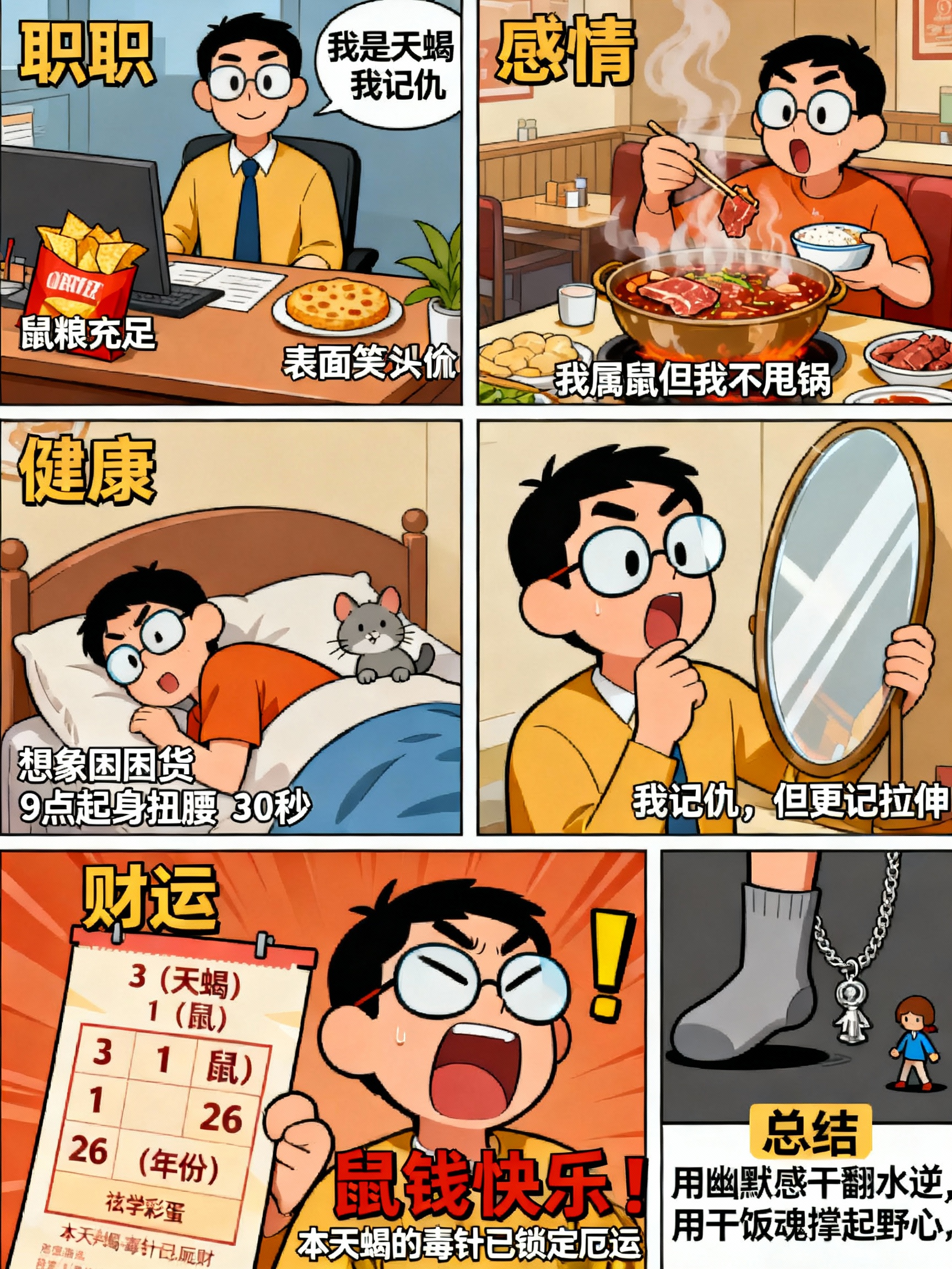 感情篇约会建议选火锅店,热气腾腾化解天蝎高冷磁场。若吵架,速念:“我属鼠但我不甩锅!” 顺便偷吃她碗里一块肉,矛盾秒变笑点。