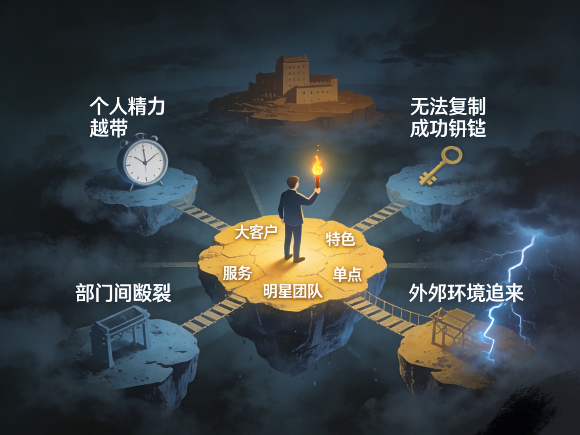 许多创业者的成功路径可以概括为“单点突破”:靠创始人的个人能力拿下一个大客户,靠一款特色服务打开市场,靠一套激励方案打造明星团队。这些在创业初期非常有效,但当企业发展到50人以上、服务覆盖多个区域时,问题就开始显现: