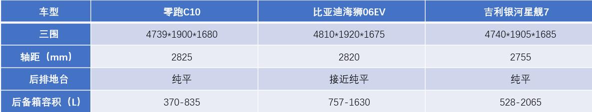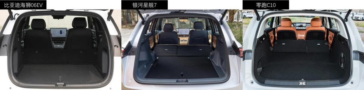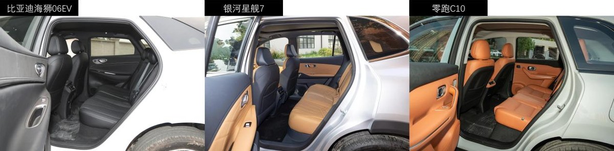 三款车在尺寸和空间设计上各有侧重:比亚迪海狮06EV尺寸最大,零跑C10和银河星舰7在长度上短了约7厘米,宽度和高度接近。从实车体验来看,海狮06EV车内空间确实宽敞,在同级中属于优秀水平;零跑C10 虽然外观尺寸略小,但以“得房率”为核心卖点,实际车内空间反而达到中型SUV水准,我个人感觉比海狮06EV还要大一些;相对而言,银河星舰7的后排空间稍显局促。