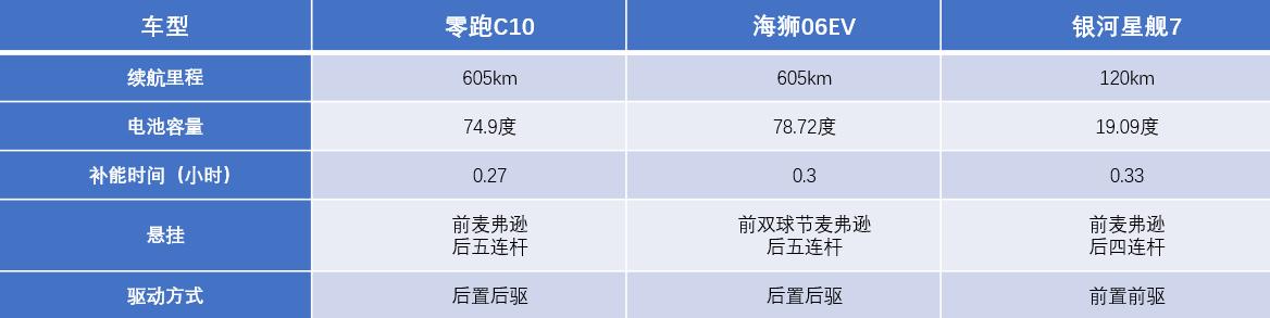 续航与底盘:决定日常体验的关键续航方面,零跑C10和海狮06EV均为605公里纯电续航,日常使用可做到1-2周充一次电。银河星舰7作为插混车型,纯电续航120公里,能满足市内通勤,但若无家充,一周需要外充2-3次,略显麻烦。长途场景下,C10和海狮06EV按春秋80%、夏冬70%的续航达成率估算,也完全够用;加之C10补能仅需0.27小时,海狮06EV为0.3小时,充电十多分钟就能再跑300公里。星舰7长途依赖加油,续航无焦虑,但用车成本偏高。