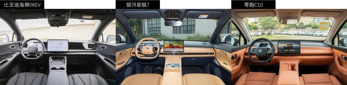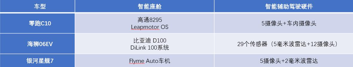 三款车型在智能化配置上差异较大。座舱部分,C10是 Leapmotor OS,海狮06EV配置的是DiLink 100系统,银河星舰7配置的是Flyme Auto车机,这其实是各家的系统,是不是好用需要看个人习惯,值得一提的是,C10配置的8295芯片可以说是当前市面上的招牌,算力嘎嘎高,是流畅车机的坚实后盾;海狮06EV 配置D100芯片,算力逊色于8295,星舰7未明确公布芯片信息,在此暂不评论。