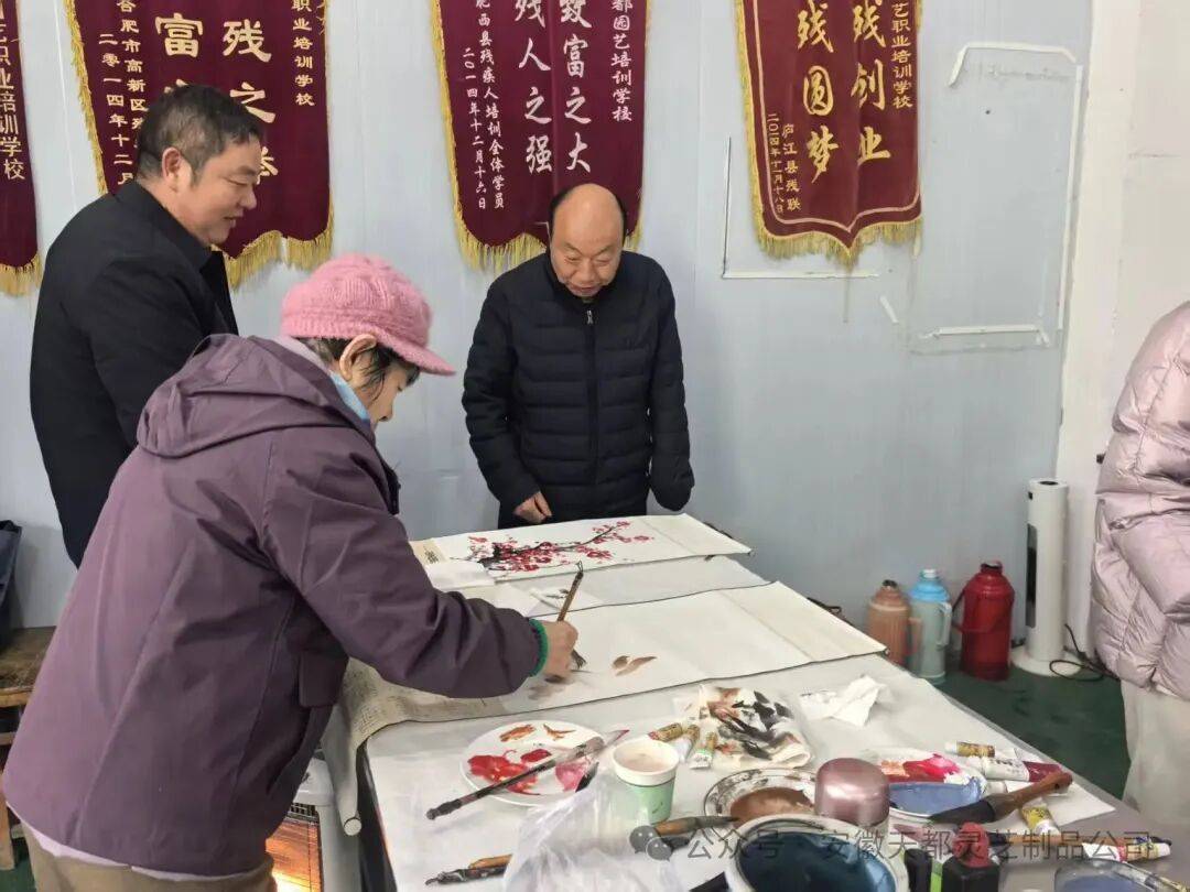 培训期间,中国书画名家专访签约书画师迎新年笔会在天都公司同步举行。来自全市的11位书画名家自带纸墨,现场奋笔疾书,书写对联、福字,创作油画、山水作品,笔笔浓墨重彩。名家们边创作边与残疾员工亲切交流,主动询问需求:“需要写什么字,我给你写;需要什么画,我给你画。”残疾员工们欣喜不已,拿到作品后异口同声地说:“感谢名家,祝福名家!”