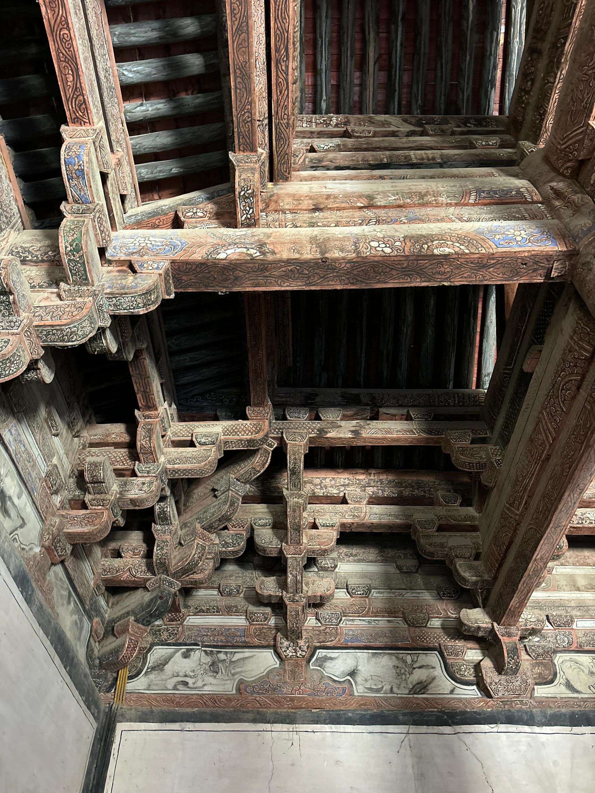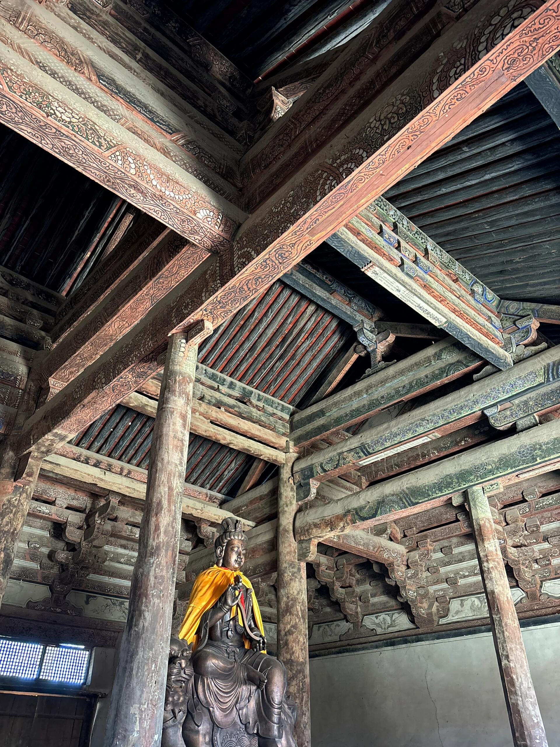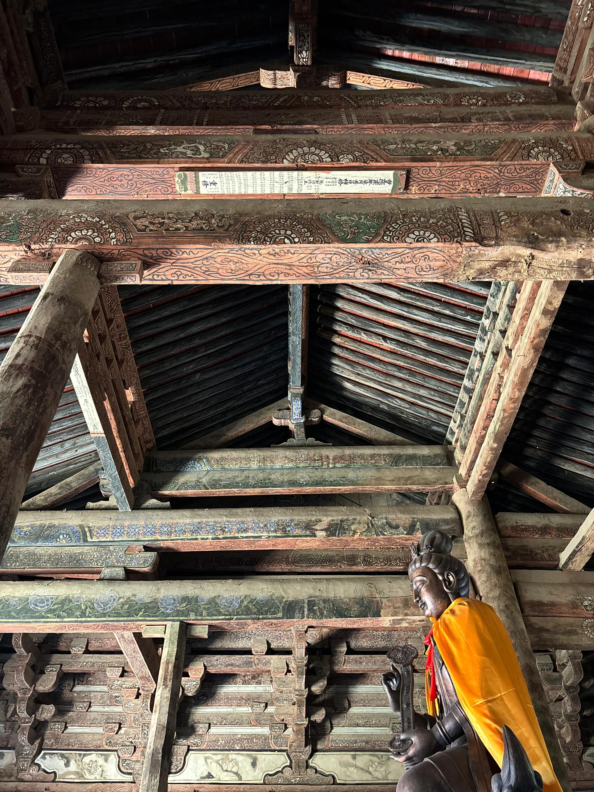 走进殿内,四椽栿对乳栿用三柱的梁架结构如骨骼般清晰可见。粗大的木梁未经过多修饰,树皮剥落处还留着斧凿的痕迹,却以最简洁的方式实现了力学平衡。当指尖抚过梁架上的墨书题记,虽因年代久远字迹模糊,却能辨出“应历十六年”的字样——这组数字不仅是建筑的生辰,更是中国现存最早的明确纪年辽代木构实证。