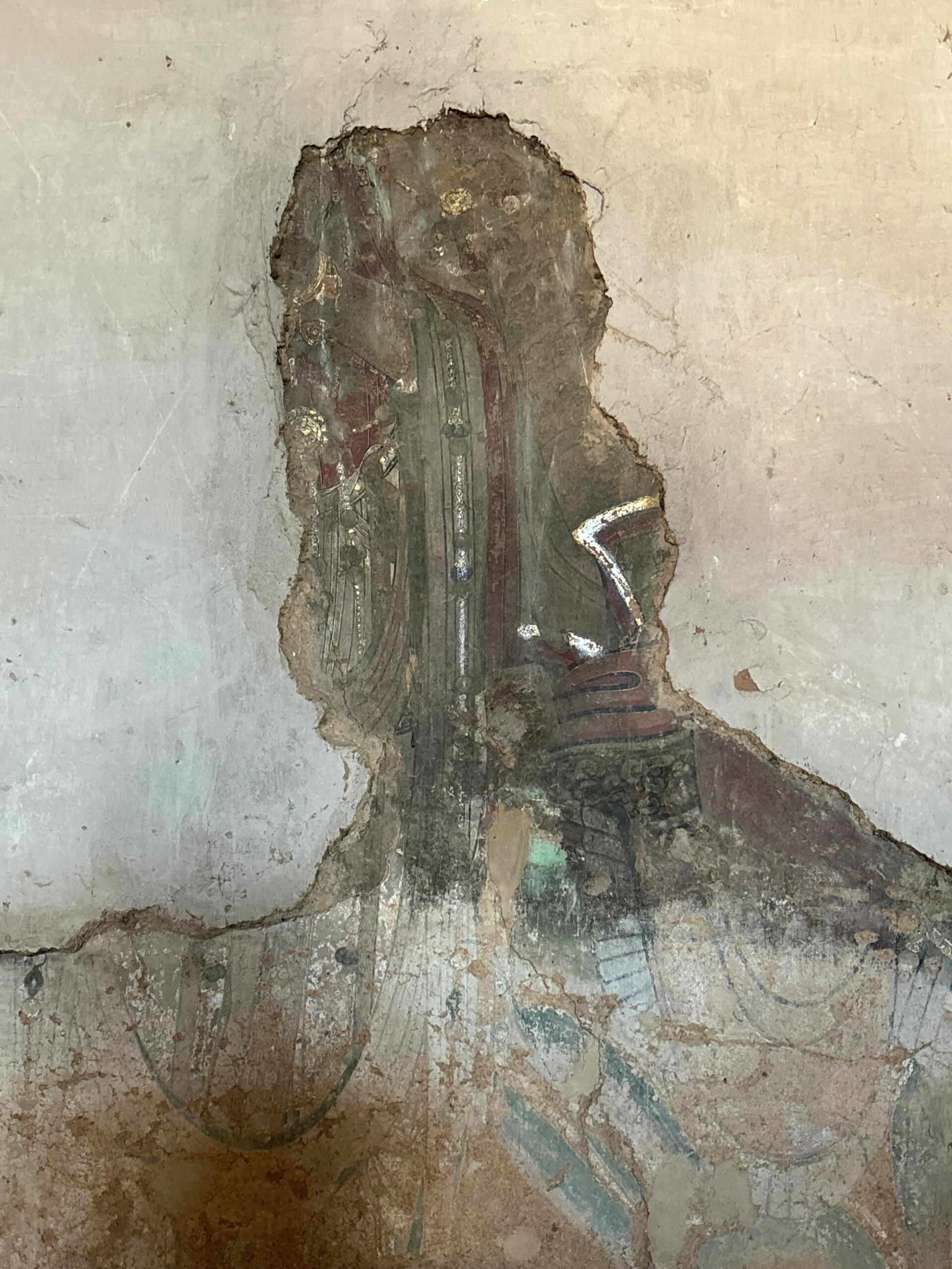 东西北三壁的壁画曾是阁院寺的“不可说”秘密。特殊时期,僧人用黄土混合麦秸涂抹墙面,看似破坏之举,却意外为壁画穿上了保护衣。当文物工作者逐层剥离泥皮时,辽代画师的笔触如晨露中的草叶般舒展:文殊菩萨手持智慧剑,坐骑青狮的鬃毛根根分明,每一根都呈现出“曹衣出水”的质感;护法明王的盔甲上,金箔贴饰虽已氧化成深褐,却依然能反射出微弱的光芒。最震撼的是北壁的《礼佛图》,供养人队伍中竟有身着契丹服饰的贵族,窄袖长袍、髡发垂肩的形象,为研究辽代民族融合提供了珍贵的图像证据。