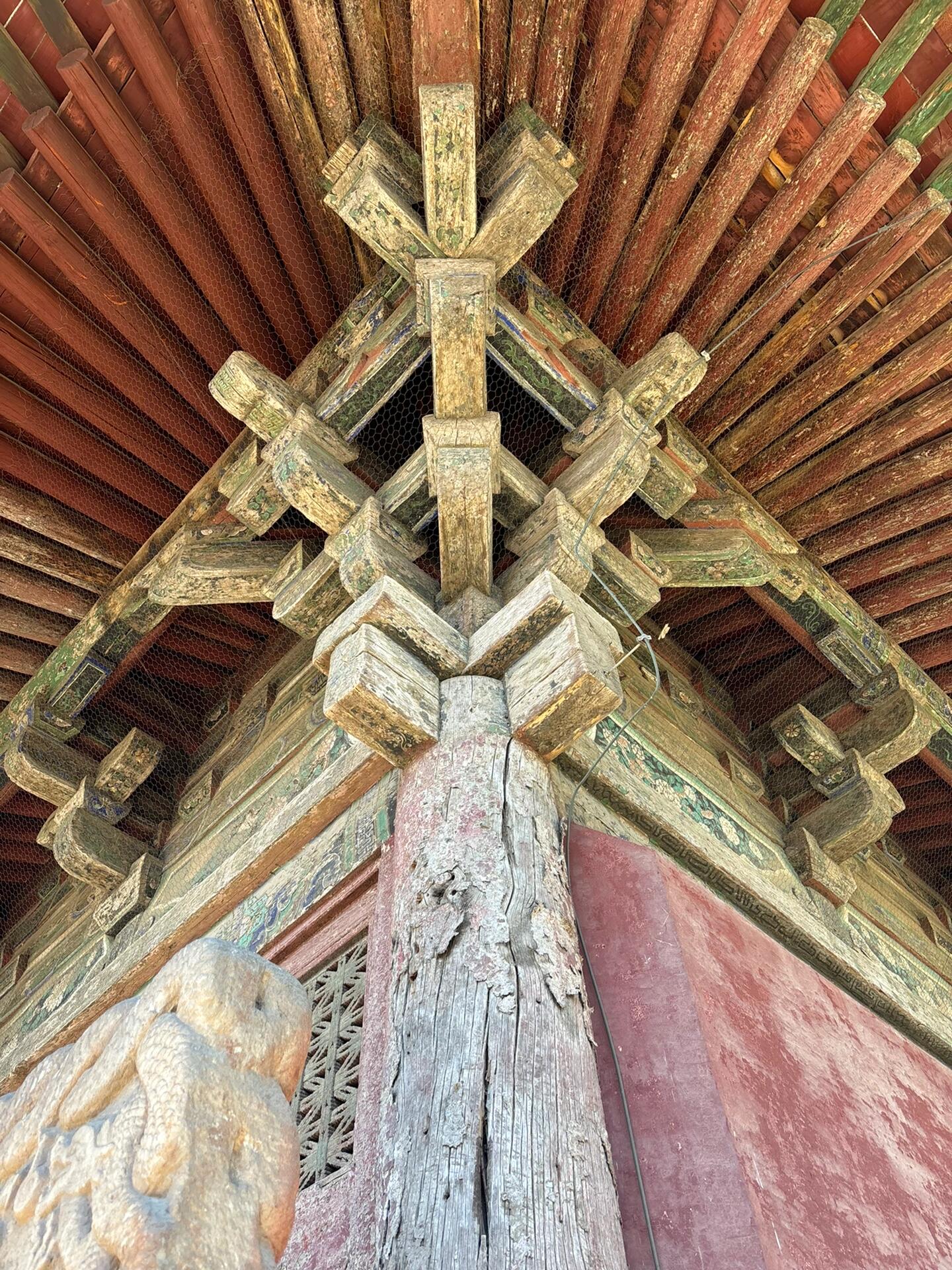 最让人屏住呼吸的是殿前隔扇门的两块辽代菱花窗棂。凑近观察,千年时光在木头上留下的不是沧桑,而是温润的包浆。每一根棂条的交接处都采用“穿带榫”工艺,不用一枚铁钉,却严丝合缝如浑然天成。菱花图案以中心圆为基点,十二根棂条呈放射状分布,这种“十二破菱花”的形制,与应县木塔天宫楼阁的窗棂如出一辙,是辽代高等级建筑的标志。