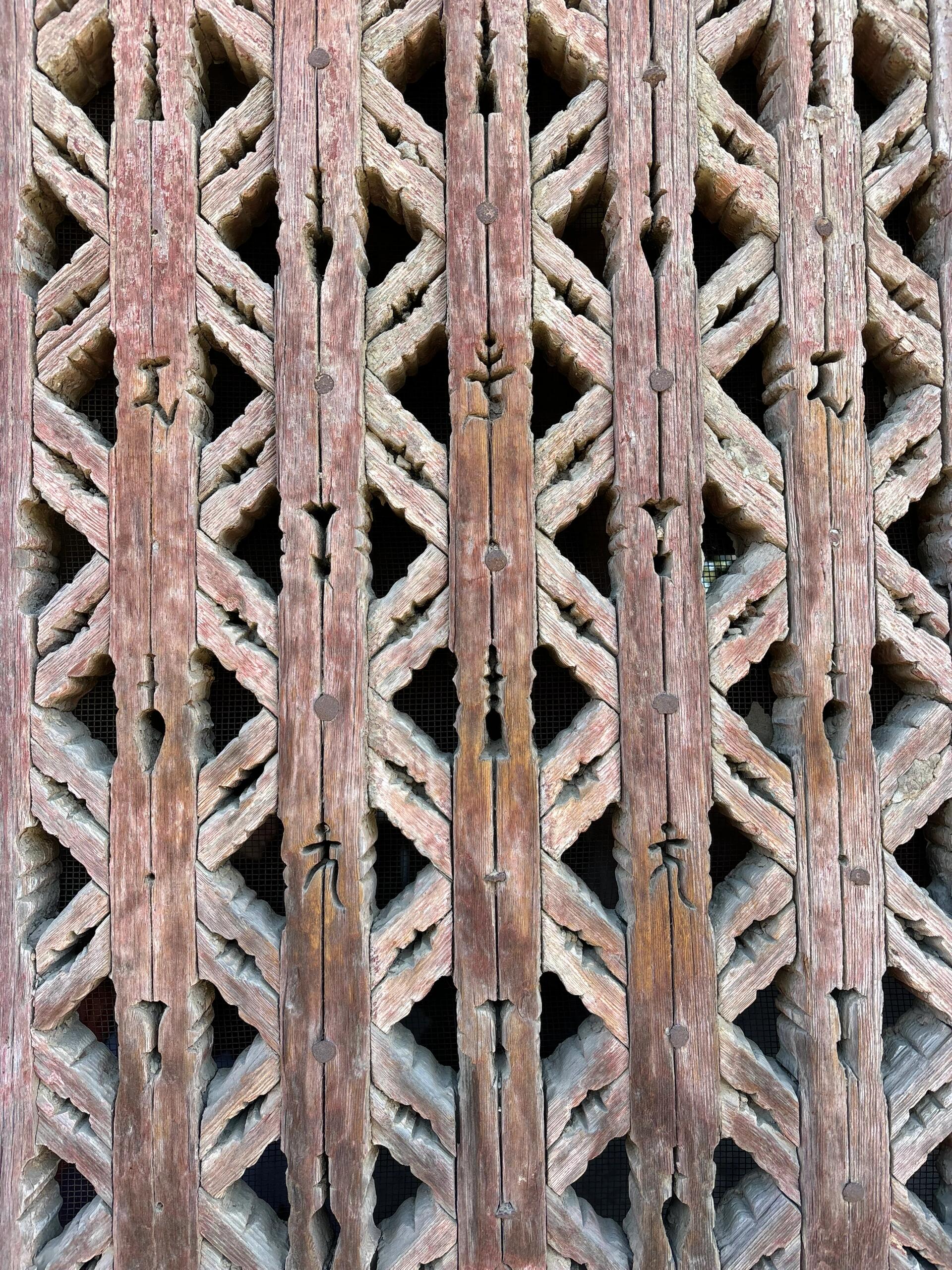 更妙的是相邻的元、明、清窗棂标本。元代窗棂采用“田字格”加冰裂纹,棂条粗壮如手臂,带着草原民族的粗放;明代窗棂演化出“步步锦”纹样,棂条细如手指,曲线更加柔和;清代窗棂则在“灯笼框”中嵌入吉祥图案,牡丹与蝙蝠的雕刻虽精美,却多了几分市井烟火气。四朝窗棂并立,宛如一部立体的中国木作美学史,让人在方寸之间看见审美潮流的变迁。