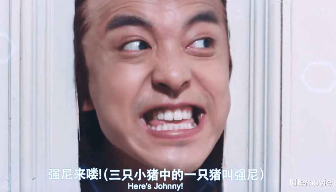 杰克在门外神经质,一斧接一斧扣人心弦,女主拿刀在屋内惊恐尖叫,女主说“杰克不要,求求你”,杰克接“here is Johnny”。
