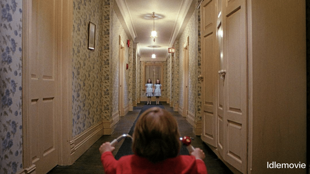 再加与丹尼平行的幽灵视角,在丹尼骑着小车穿过走廊的过程中好似鬼魂如影随形,如同丹尼口中的托尼现身一样,无形恐惧增加。