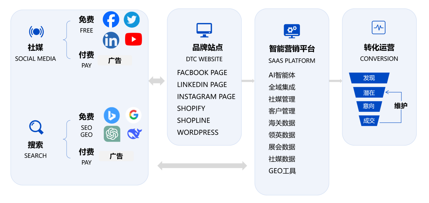AI 升级:融合 GEO搜索优化、AI 智能体等前沿技术,提升营销效率和内容权威度。