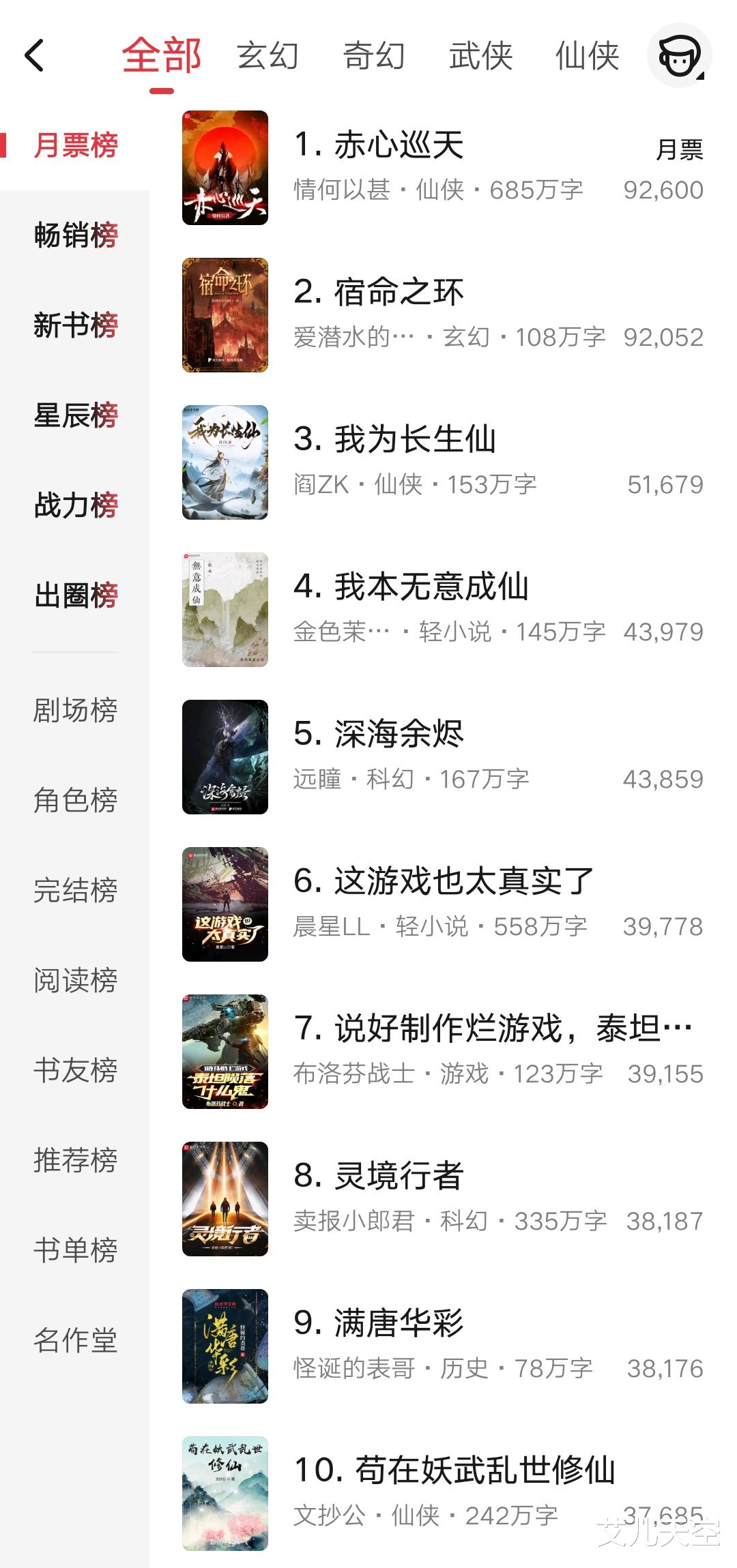 和上个月类似,情何以甚的《赤心巡天》在月末阶段反超了乌贼的《宿命之环》暂时居于月票榜第一。
