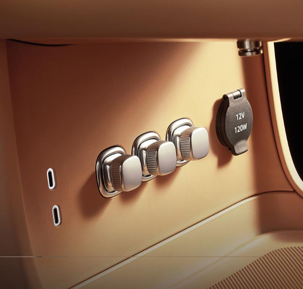 细节方面,副中控台底部的镂空储物格前部带有香氛系统,另外还提供了USB接口以及12V电源接口。