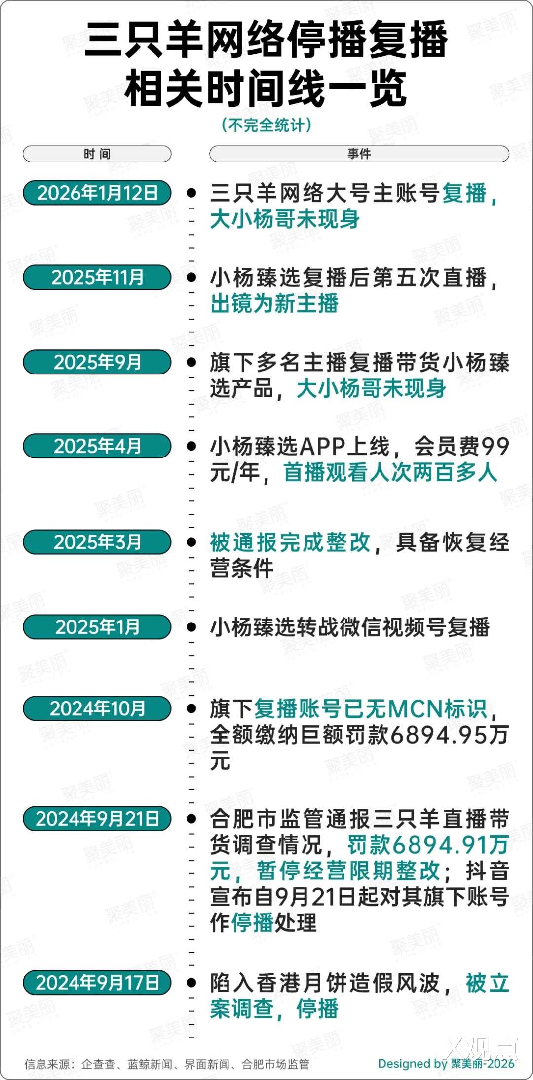 2024年“香港美诚月饼”虚假宣传风波后,三只羊被罚6894.95万元,全矩阵停播整顿,累计赔付消费者2777.85万元,并完成89项整改措施,终于在2025年通过评估,具备恢复经营条件,正式步入解冻期。