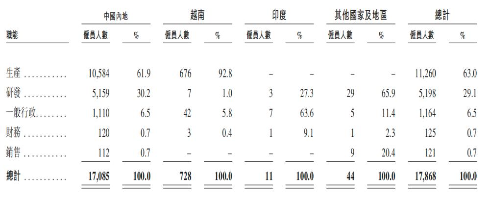 截至2025年9月30日,龙旗科技有17868名全职员工,其中17085名在中国内地任职,728名在越南任职,11名在印度任职,及44名在其他国家和地区任职。其中,研发人员约5198名,占员工总数约29.1%。
