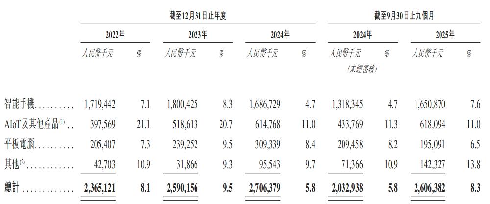 在过往记录期间,龙旗科技的收入主要来自全栈ODM解决方案,以及与智能产品相关的增值专业服务,业务覆盖智能手机、AIoT 设备、平板电脑及其他智能产品的制造与销售。因此,其经营业绩受整体智能产品市场需求的影响,尤其是品牌客户的智能产品需求。