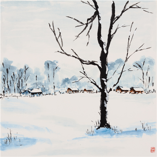 吴靖的参展作品以“春、夏、秋、冬”为明晰脉络,构筑起一场四季的诗意轮回。每幅作品均配有自题诗作,形成“画为视觉之诗,诗为文字之画”的互文关系:从《春天里之紫藤花》的蝶舞藤蔓,到《仲夏荷塘盛花》的鸟戏莲叶;从寓意秋日的绚烂枝干,到《初冬月夜》的鹤栖梅枝。艺术家以水墨为媒介,通过精妙的构图与色彩,将自然意象的生机、繁盛、静美与清寂娓娓道来,邀请观者步入一个画意与诗情共鸣的时空画廊。
