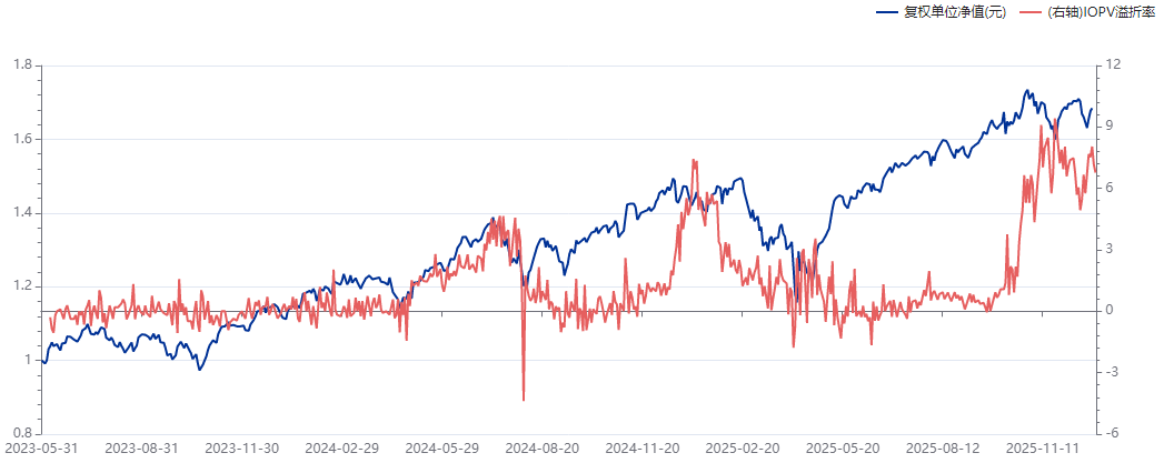 我这里做了一个图,是某美股基金的净值走势(蓝线)和溢价情况(红线)。