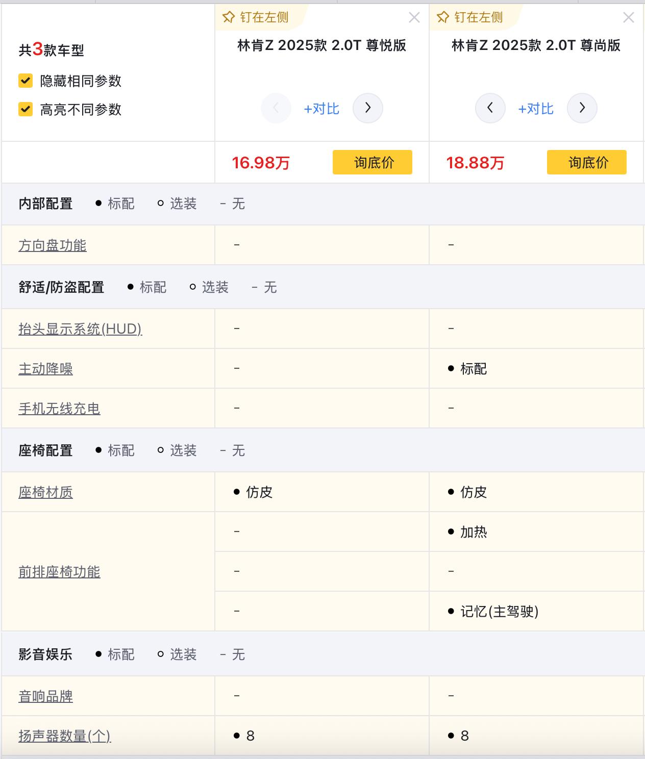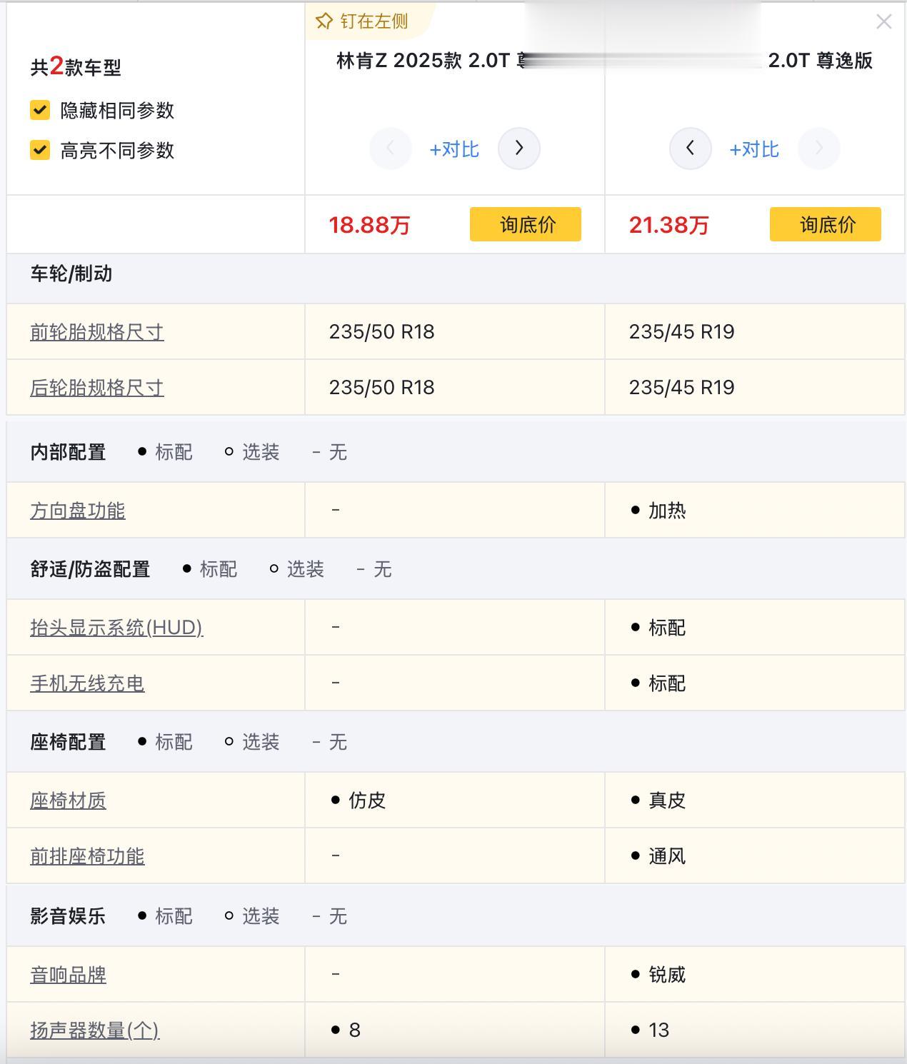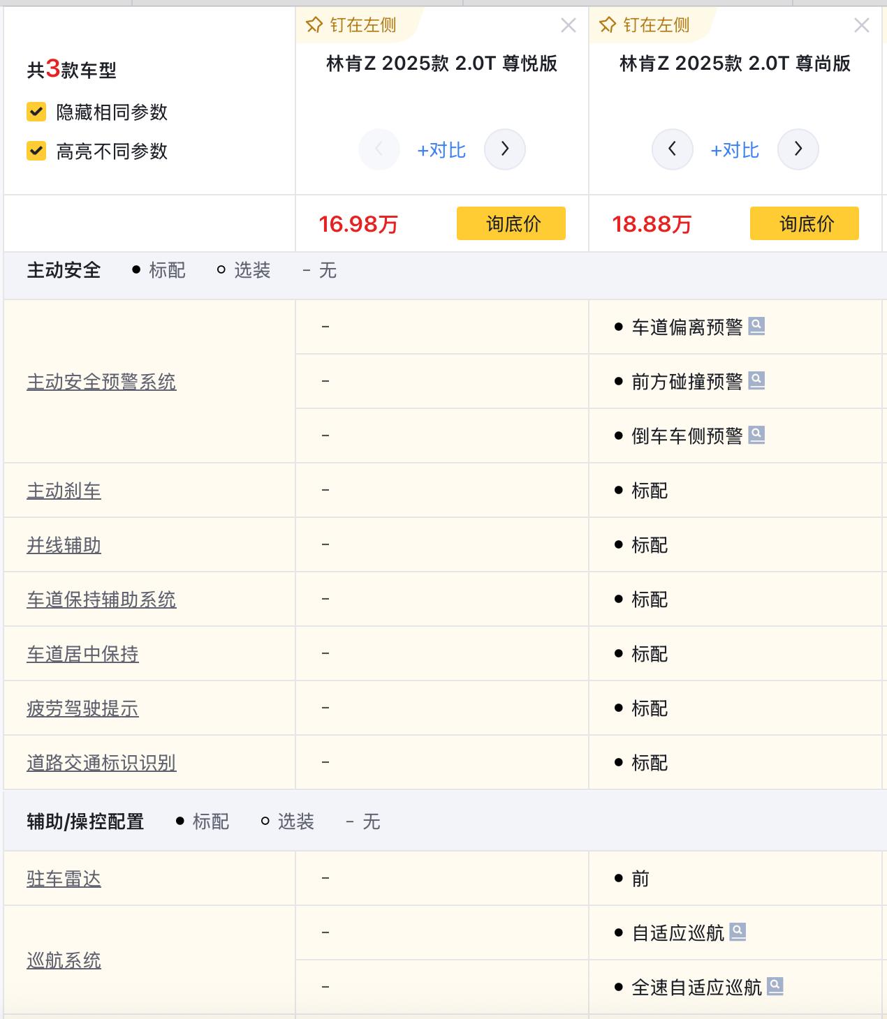 首先来看尊悦版和尊尚版,指导价分别为23.58和25.48万元,价格相差1.9万元,配置上,后者多了L2级别的驾驶辅助,多了全速自适应巡航、车道偏离预警、前方碰撞预警、倒车车侧预警、主动刹车、并线辅助、车道保持等功能,其他方面,多了主驾驶座椅记忆、前排座椅加热、自适应远近光灯、前驻车雷达等配置。个人觉得升级还是很实用的,毕竟像L2级别的驾驶辅助系统,放在当前可以说是一个标配了。