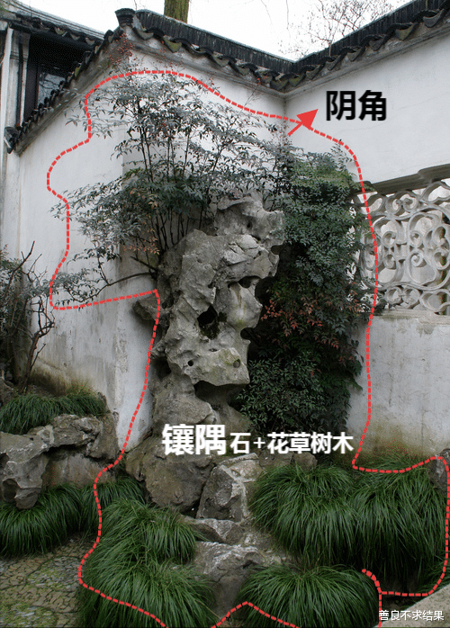 【镶隅、抱角】墙之内角(阴角)的景石,以镶嵌之势布局,加以花草树木,便是“镶隅。”