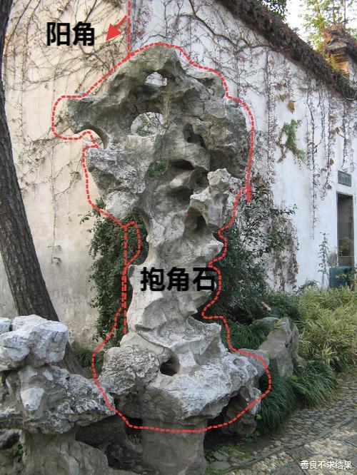墙之外角(阳角)的景石,以环抱之态点缀,加以花草树木,称作“抱角”。一镶一抱,既解决了墙角的实用加固问题,又成就了中式园林的造景闭环,不得不佩服古人把“无用角落”变废为宝的智慧。