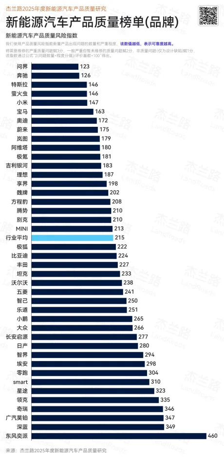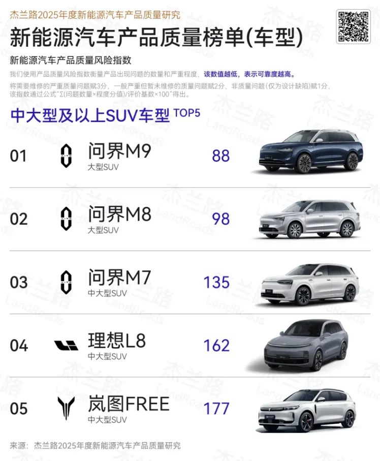 在市场规模持续增长的同时,问界确保了产品质量的稳定与可靠。根据杰兰路《2025年度新能源汽车产品质量研究报告》显示,问界品牌荣登新能源汽车产品质量榜单榜首,其旗下的问界M9、问界M8、问界M7更包揽了中大型及以上SUV车型质量前三名。