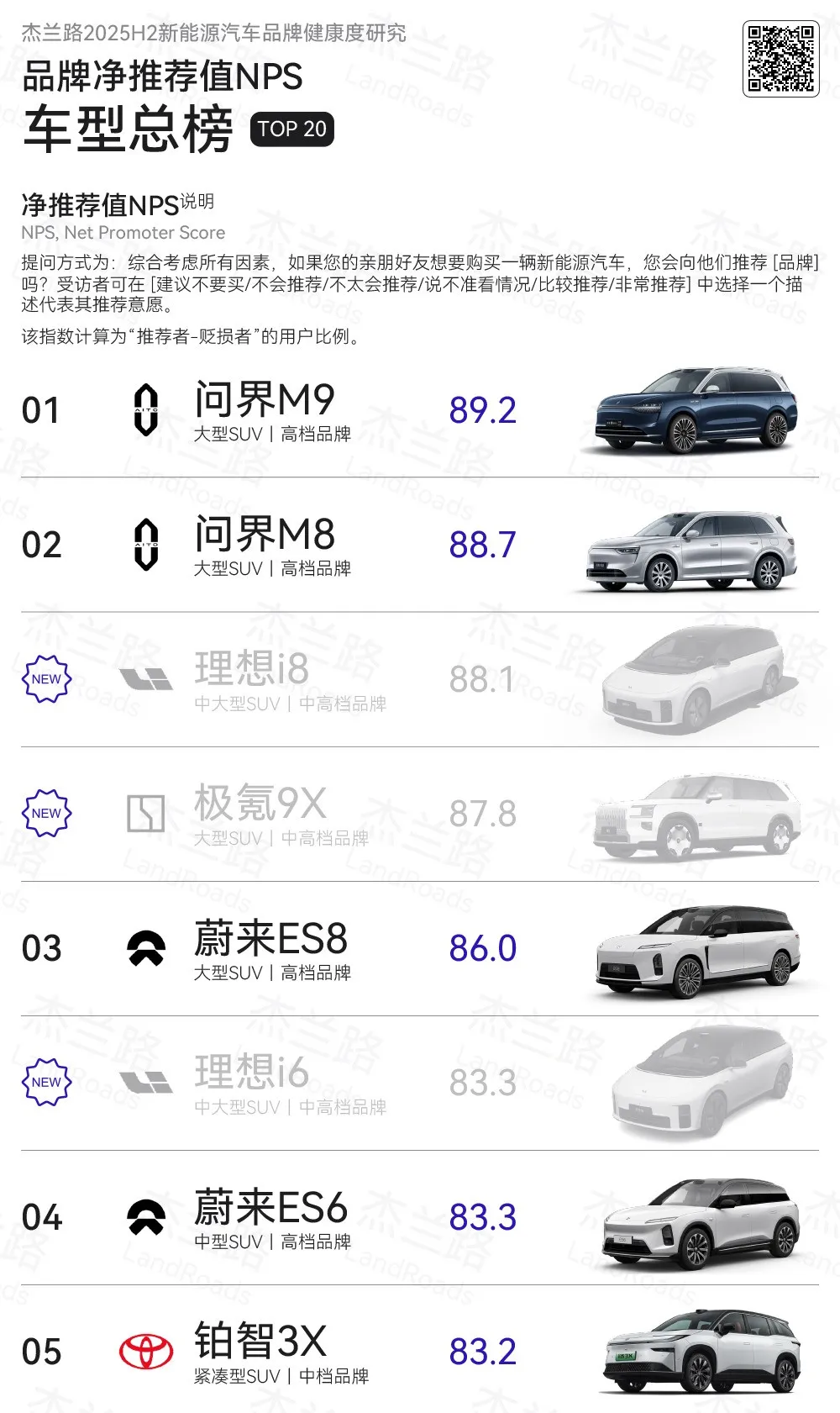 问界M9连续四期蝉联NPS(净推荐值)第一,成为首个且唯一获此评价的新能源SUV车型,问界M8首次参评即位居NPS(净推荐值)第二。
