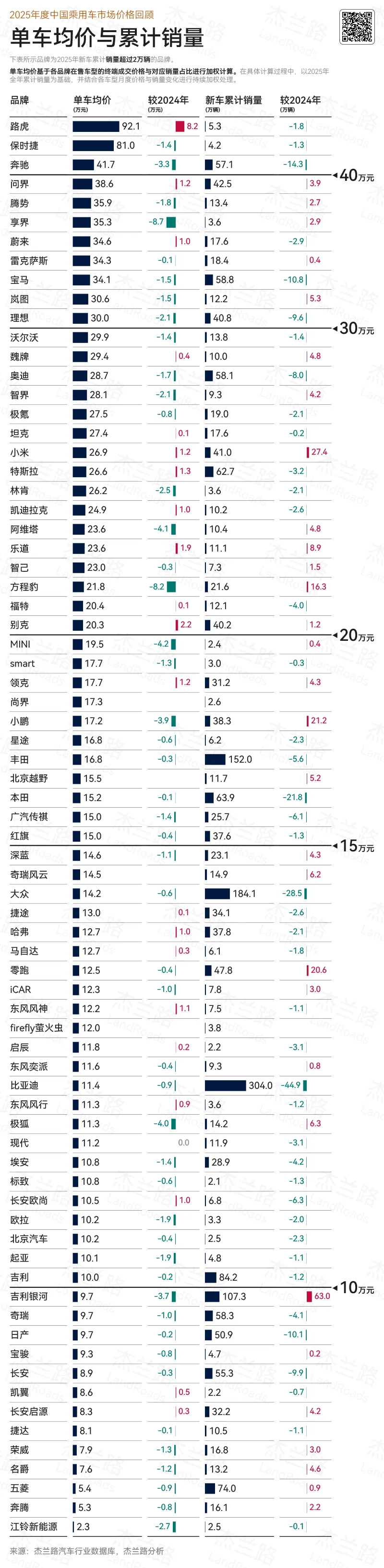 根据杰兰路《2025年乘用车品牌单车成交均价与销售额报告》,问界2025年单车成交均价达38.6万元,位居造车新势力榜首,全年累计交付量突破42万辆,成功走出一条「量价双升」的增长之路。