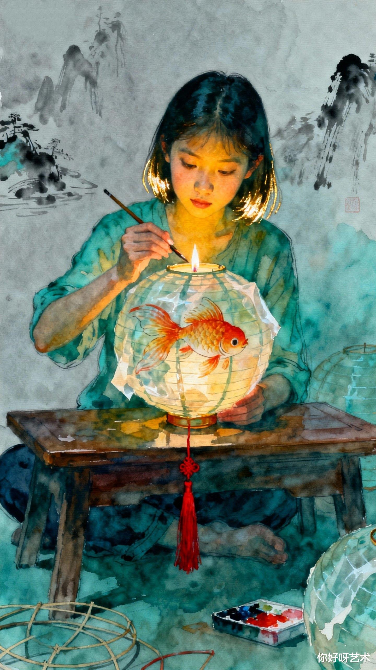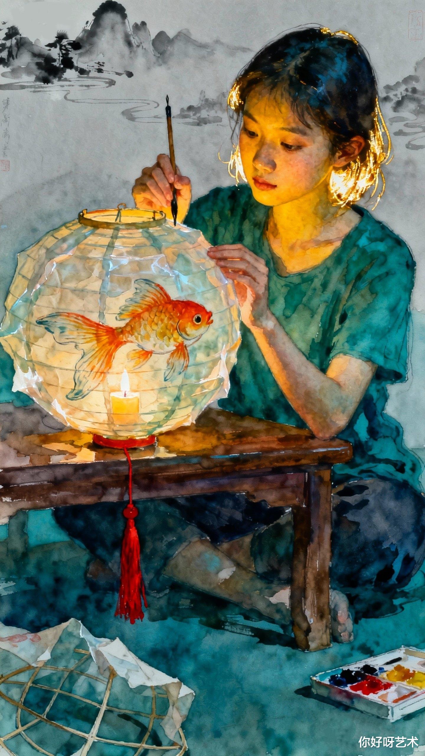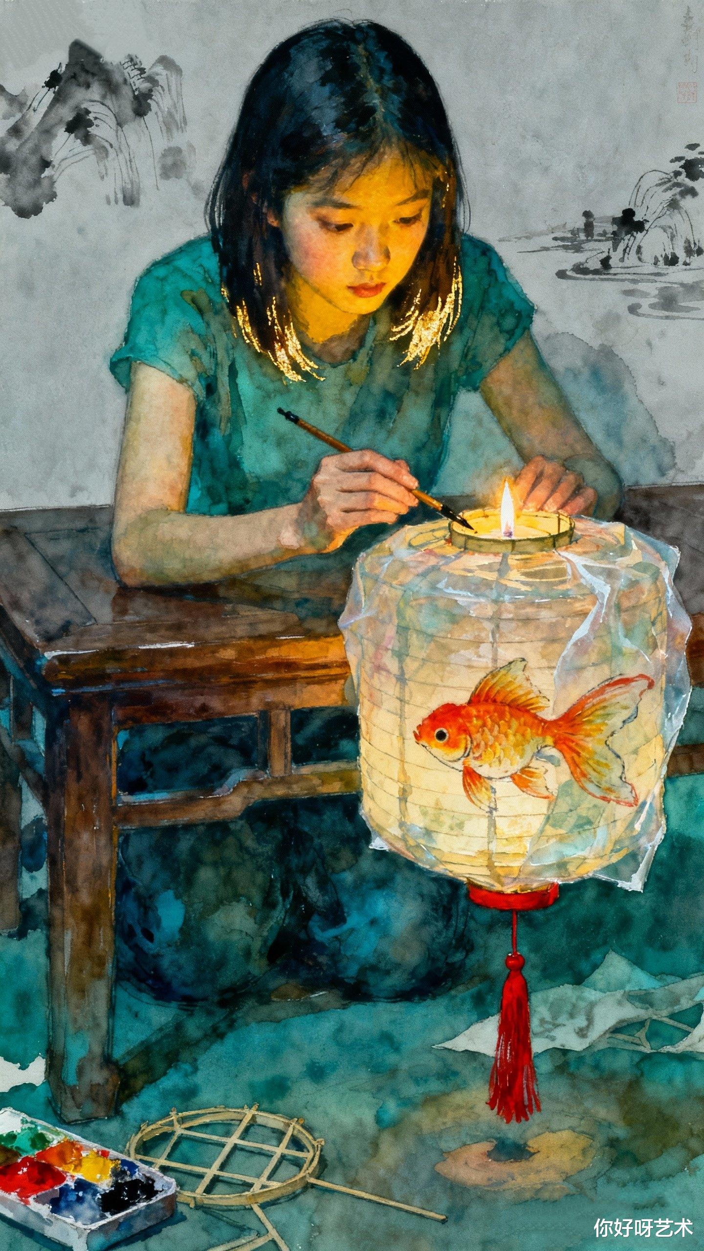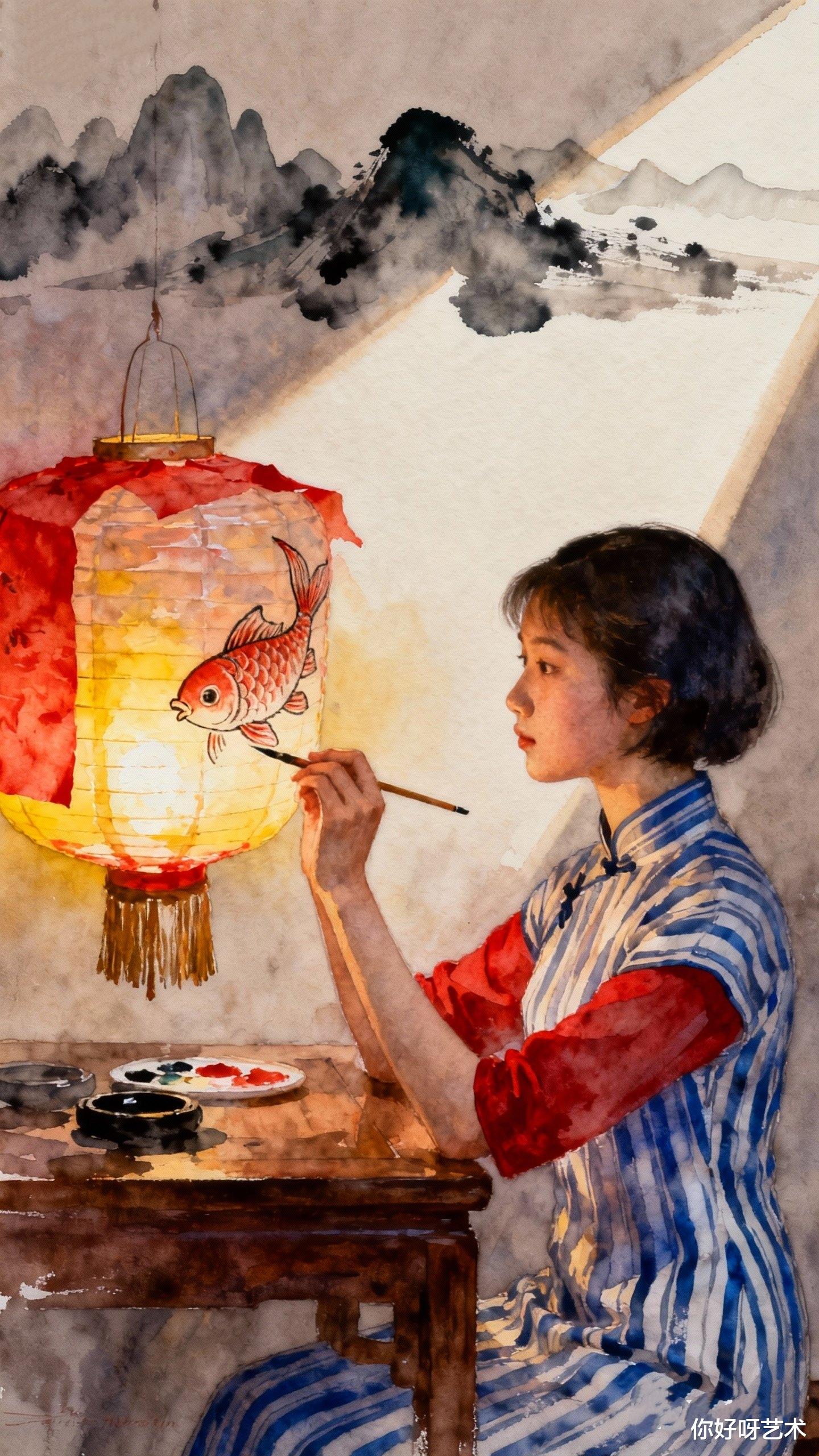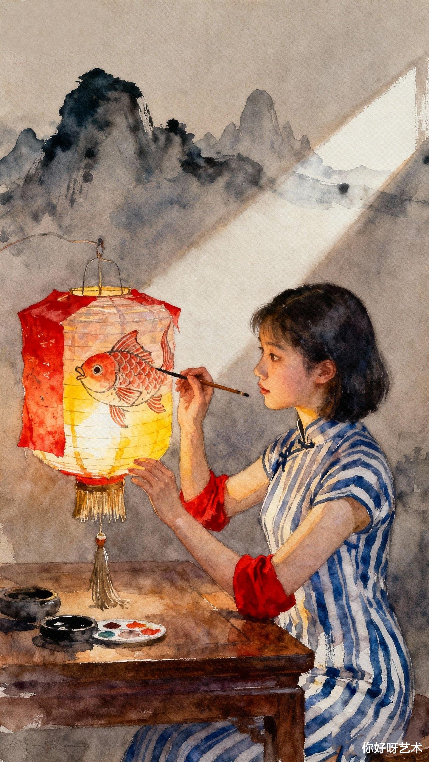 夜深了,我望着画中少女与鱼对视的瞬间,忽然明白水彩最动人的地方,在于它永远保留着未完成的可能。就像冬日的河水表面冻结,深处却依然流淌;就像我们每个人心中,都藏着一条渴望跃出水面的鱼。