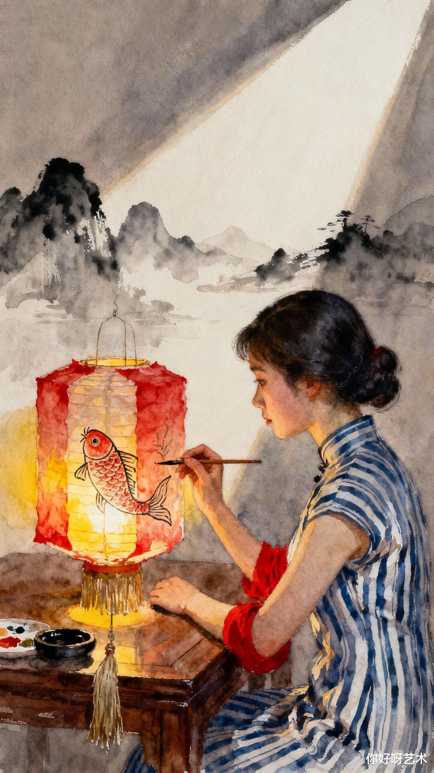 当暮色开始吞噬最后一缕天光时,我完成了最后的点睛之笔——少女耳后的一缕碎发,用极细的笔触勾出,在暗处微微泛着蓝光。这抹蓝让我想起家乡冬夜里的河,水面结着薄冰,水下却有暗流涌动。画中的鱼正张开嘴,仿佛要吐出一个气泡,而少女的唇边挂着若有若无的微笑,像冬日里突然绽放的腊梅。