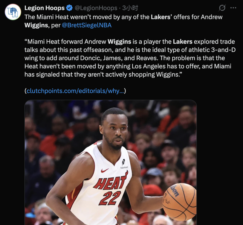 热火前锋维金斯是湖人上个休赛期曾探讨过交易的球员,他是一位运动能力出色的3D侧翼球员,非常适合围绕东契奇、詹姆斯和里夫斯建队。问题在于,热火对湖人方面提供的任何筹码都不为所动,湖人似乎只能拿出八村垒和另一份到期合同匹配,这看起来缺乏诚意。热火方面也已表明他们并没有积极兜售维金斯。