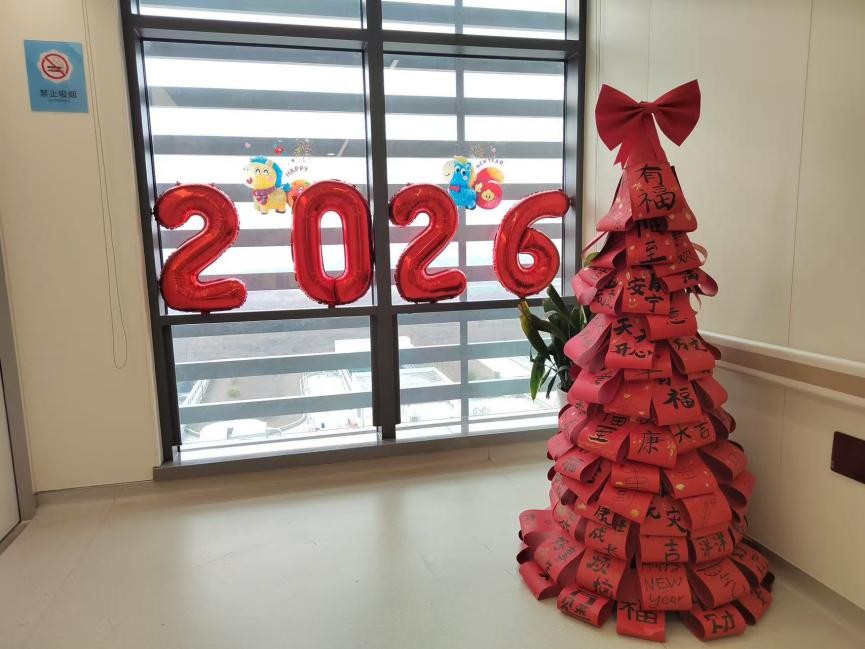 (人民日报健康客户端记者 赵苑旨)“平安二字值千金,和顺一门生百福……妈妈,快看!这是我昨天写的对联,漂亮吧!”1月28日中午,刚走出病房的小梅(化名)拉着母亲的手,在浙江大学医学院附属儿童医院莫干山院区血液肿瘤内科副主任徐卫群的办公室门前,停住了脚步。她仰头看着墙上那幅略显稚嫩却格外工整的春联——那是她前一天在“病房学校”活动中,用乏力的手一笔一画写下的。顺着走廊望去,两侧贴满了孩子、家长与老师共同书写的新年心愿,还有五彩拓印的年画,每一扇病房门上的“福”字,同样是稚气中透着认真。