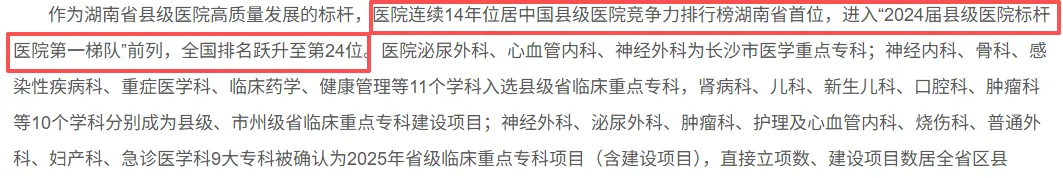 它作为湖南省县级医院高水平发展的典范,已经连续14年排在中国县级医院竞争力榜的湖南省头名,还进入了“2024届县级医院标杆医院第一梯队”的前列,其全国排名也爬升到了第24位,院里的神经外科,心血管内科,还有泌尿外科都是省市的重点专科。