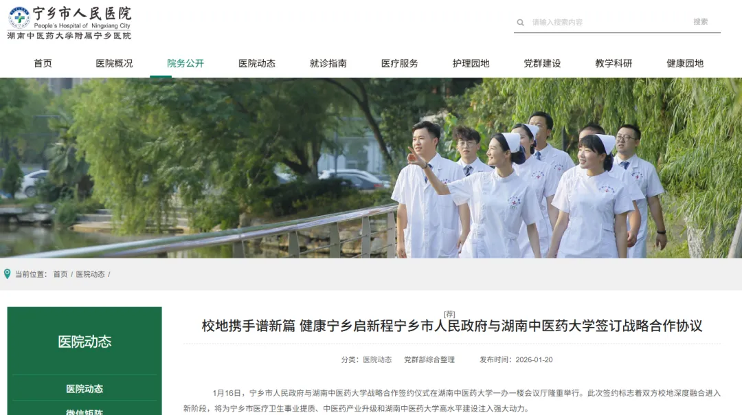 就在这个局面之下,湖南中医药大学完成了个大动作,1月16号那天,湖中医和宁乡市政府签了约,宁乡市人民医院被正式收纳进直属附属医院的管理之内,财贸医院也一起被纳入,一次性就新添了两家直属医院,这在湖中医的办学经历里属于首次。