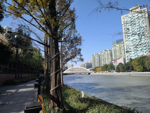 直至2008年5月,在此建成开放总面积约16000平方米的河滨绿地,让该地块重新焕发了新生,因其平面轮廓酷似字母“W”,形如一只展翅欲飞的蝴蝶,故得名蝴蝶湾。