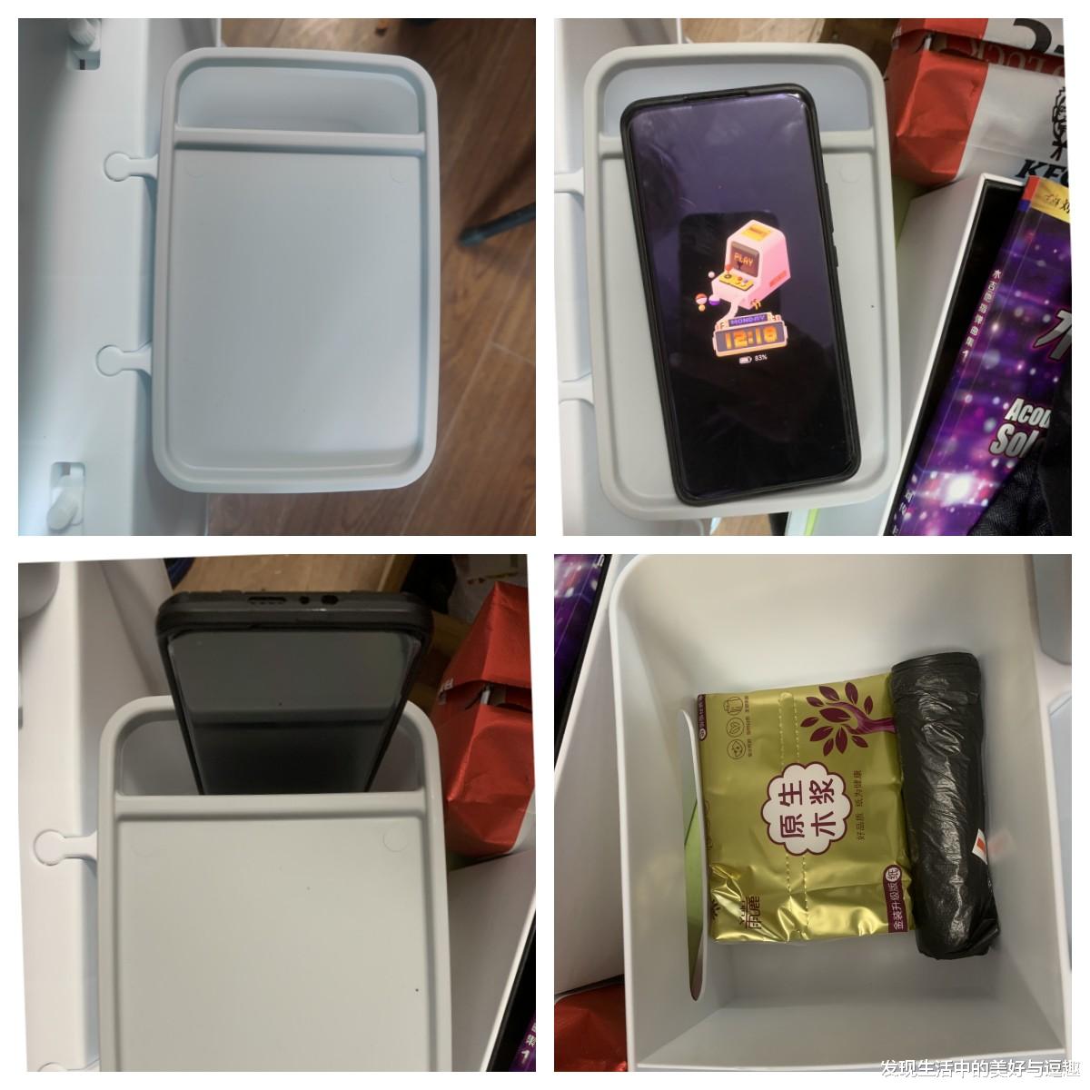 右手边是个小盒子,可装卫生纸、塑料袋,并且还可以放手机。