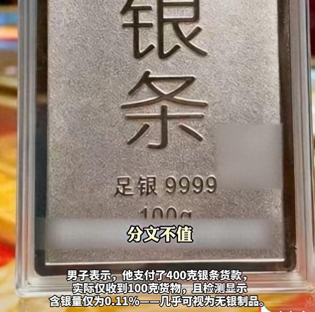 据媒体报道,河南郑州一男子网购400克投资银条,收货后发现实际仅100克,检测含银量仅为0.11%,商家却辩称“图片上错但已提前告知”,引发网友热议。