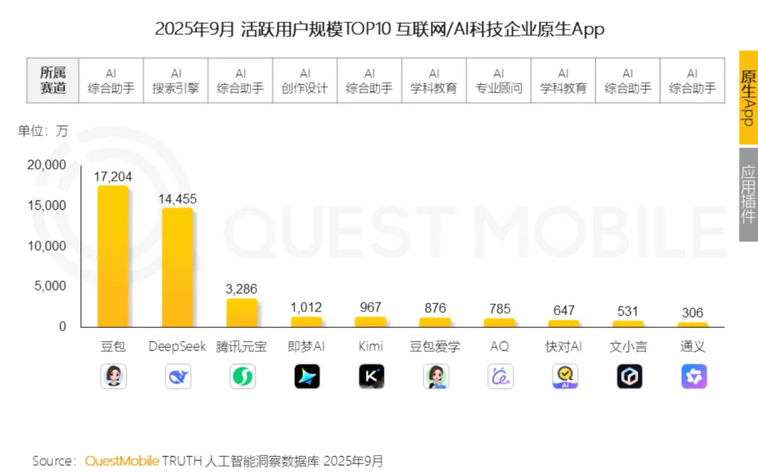 国内市场上,QuestMobile的数据显示,9月豆包 App的月活达到1.59亿,DeepSeek1.46亿排名第二,第三的腾讯元宝0.31亿,差距就有点大了。