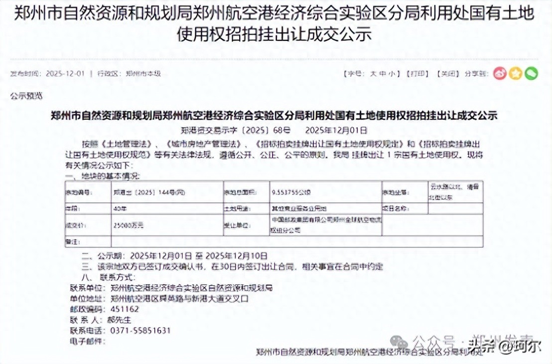 根据成交公示来看,受让单位为中国邮政集团有限公司郑州全球航空物流枢纽分公司,这个项目就是筹备已久的中国邮政航空枢纽项目。