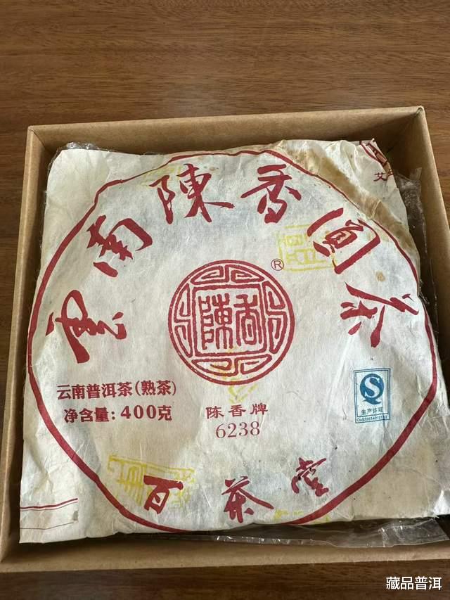 陈香牌圆茶第八代熟饼,唛号是6238,茶版印刷是一贯简洁的风格,字体以红色为主,“云南陈香圆茶,百茶堂”几个大字赫然印在上面,右侧还有QS标识,辨识度很高。