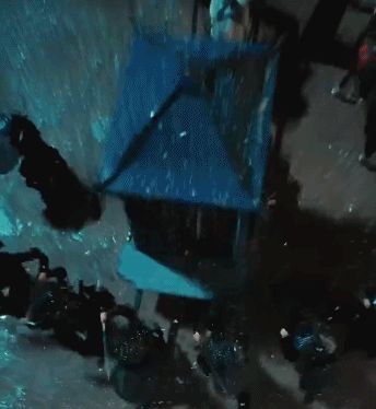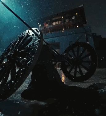 随后,画面聚焦于喷火艺人跃动的火焰,刀光一闪,护卫猝然倒地,配乐骤停。紧接着,尖锐的唢呐声撕裂寂静,面具刺客骤然现身,危机轰然降临。