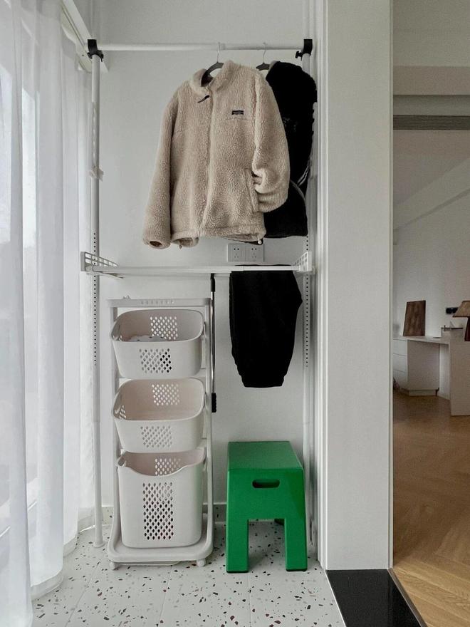 所以,这块小角落已经成为了我的小小挂衣区。比如不太脏的衣服,烘好需要通风的衣服,都可以挂在这里,而且还能隐形。