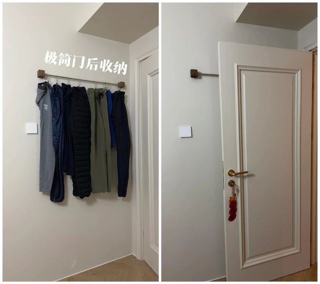 门后有支撑点的话,用一根「伸缩杆+挂钩」就能打造一块挂衣区,简单实用,还不浪费空间。