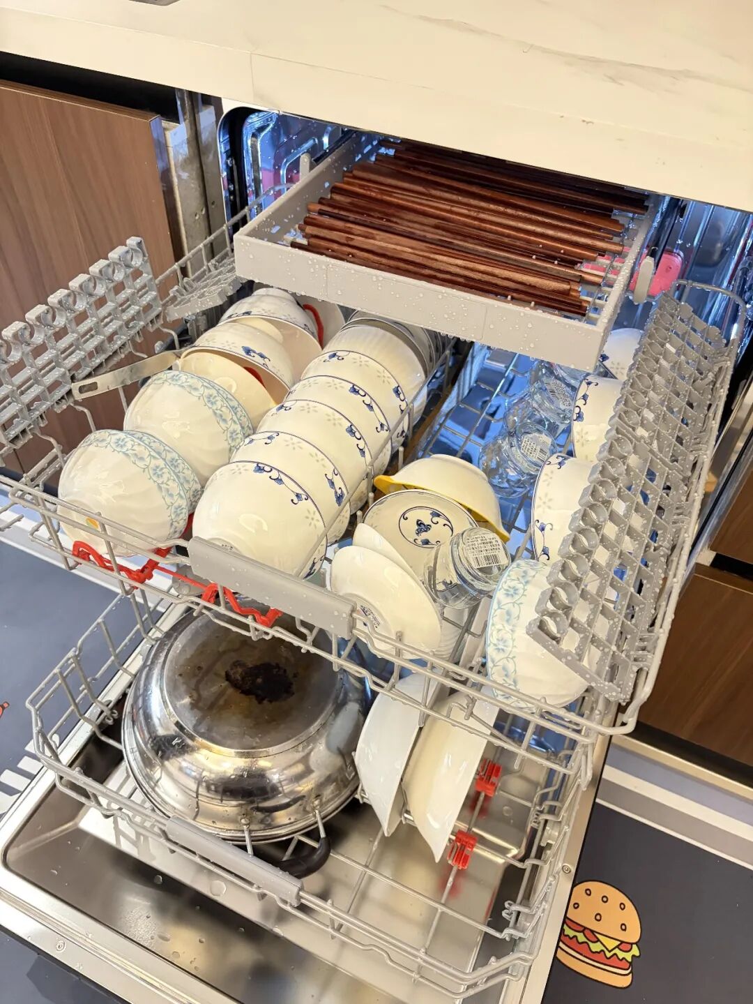 用洗碗机玻璃杯洗出来锃光瓦亮,比手洗的不知道干净多少倍。逢年过节聚餐,一堆油腻的碗盘往里一塞,该喝茶喝茶,该聊天聊天,不比蹲在厨房洗半小时强?