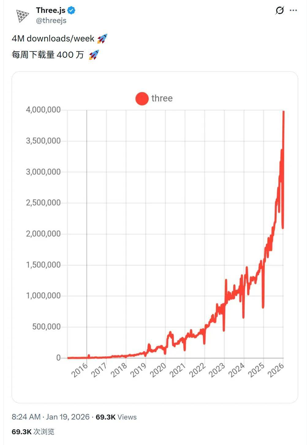 近日,Three.js 官方 X 账号公布:Three.js 每周下载量突破 400 万。